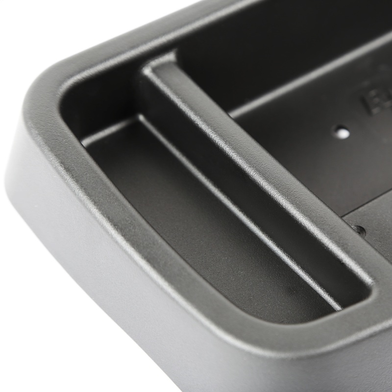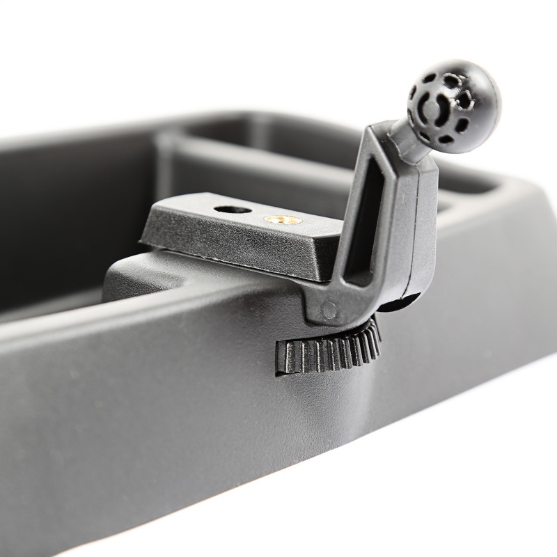 This new system includes a 2 section tray, which can be utilized to store coins, pens or sunglasses, and features both tripod and ball socket mounts to keep cell phones, GPS, cameras and even radar detectors within reach of both the passenger and driver. The form fitting design matches the exact contours of the factory Wrangler dashboard, and is secured with self-drilling screws. Patent No.